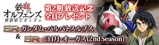 「機動戦士ガンダム 鉄血のオルフェンズ」第2期放送を記念して、期間中にゲームにログインするだけで、「SR ガンダム・バルバトスルプス」をLv99、HP MAX、出撃EN MAXの状態でプレゼント!!