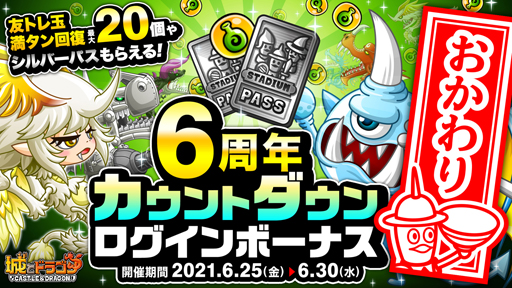 『城とドラゴン』の6周年を記念したキャンペーン「ありがとう6周年!城ドラ大感謝祭おかわり!」が2021年6月30日(水)より開催されます。これに先駆けて、6月25日(金)よりカウントダウン ログインボーナスが開催されます。ゲームにログインして、特大キャンペーン開催までを楽しみにお待ちください。
